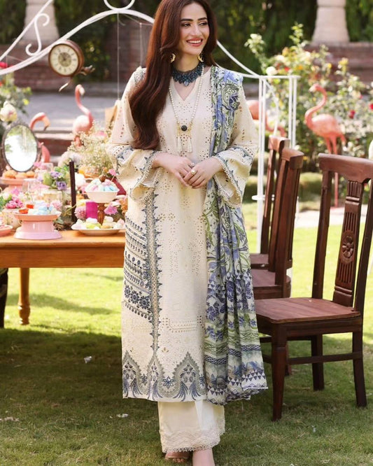 Elaf Cream Lawn Embroidery Chikankari Dress 3pc Luxury Collection- Rs.6,050.00
