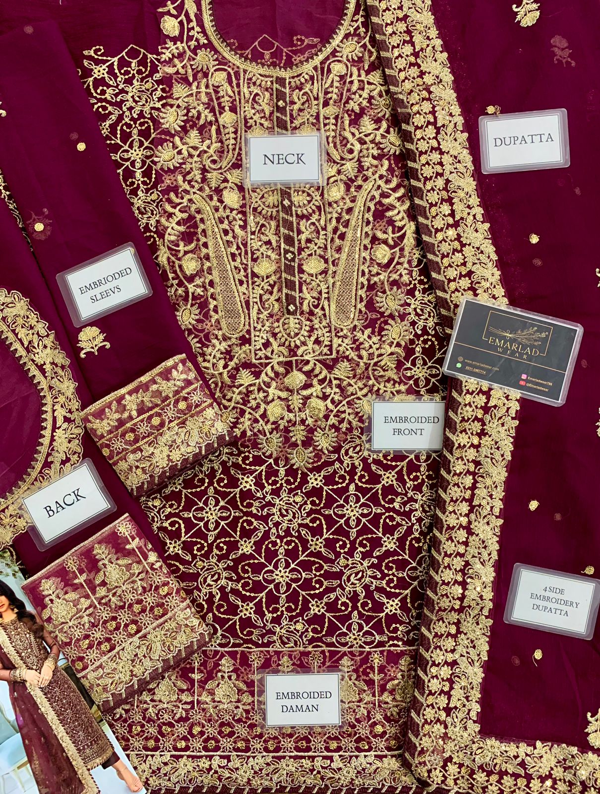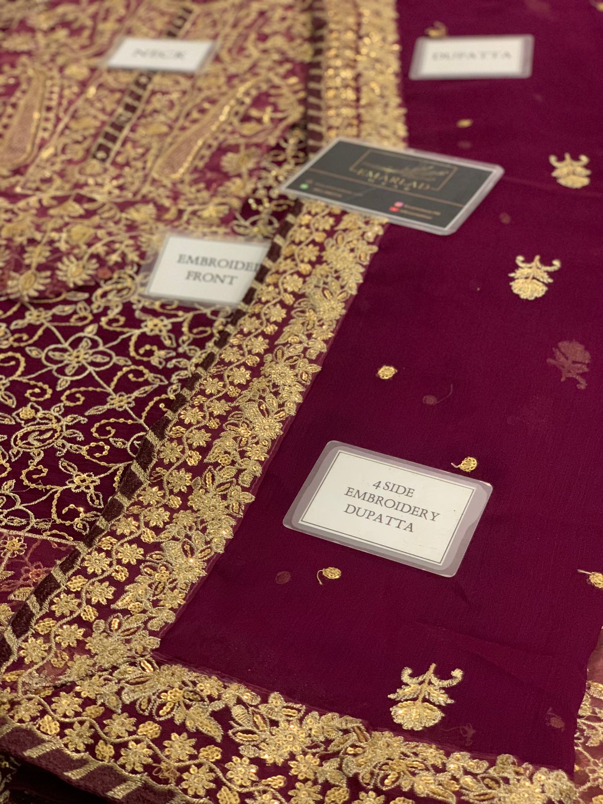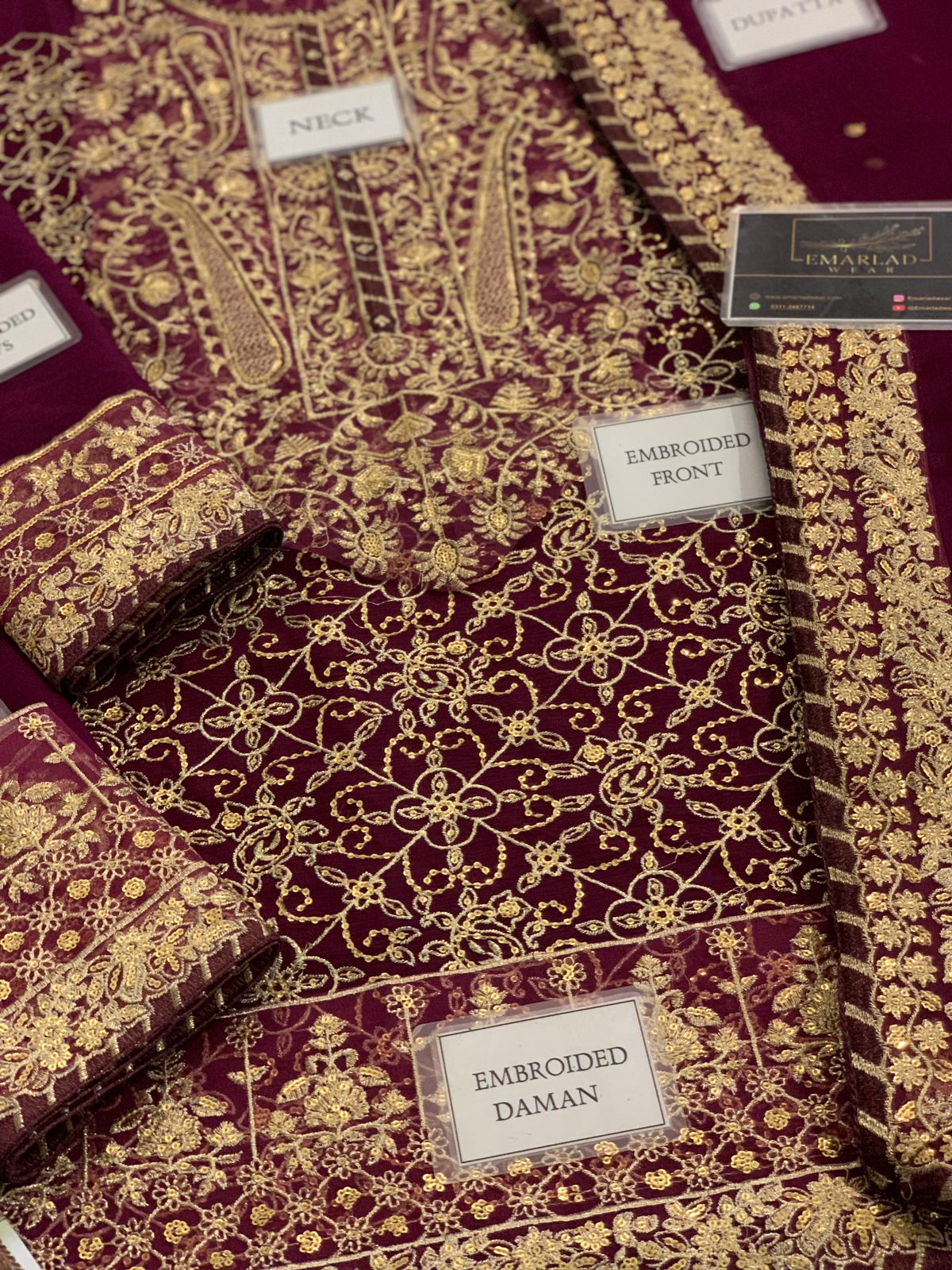 • Plain chiffon back with heavy embroidered spangle work back daman border, embroidered spangle work back gala, and embroidered spangle work chak lace.