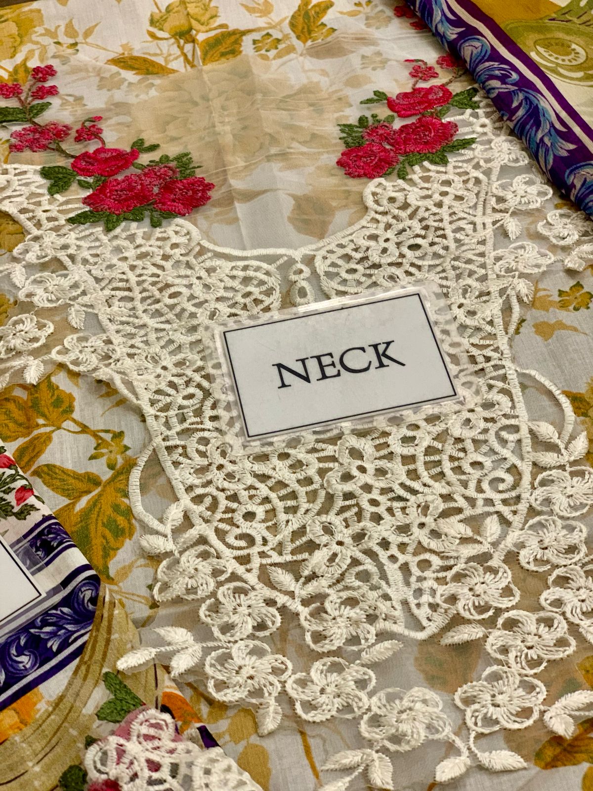 Digital printed lawn front with heavy embroidered spengle work neckline, embroidered daman bunches, and a heavy embroidered daman border