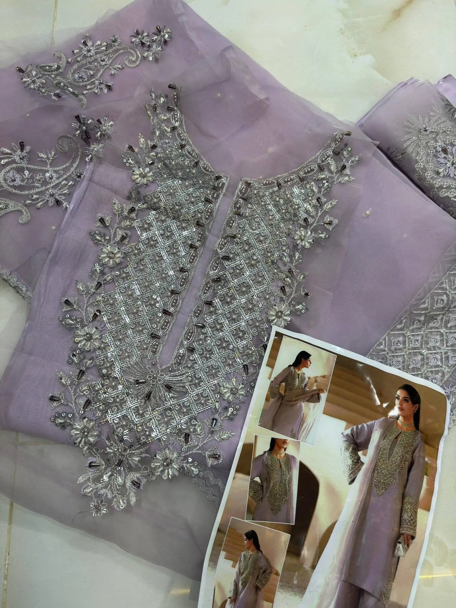 EmeraldWear Exclusive Design crafted from premium Lava Silk in an elegant lilac shade. The shirt features intricate embroidery on the neckline and sleeves, paired with a beautifully detailed organza embroidered dupatta. This timeless outfit is perfect for formal and festive occasions, offering a graceful and refined look.