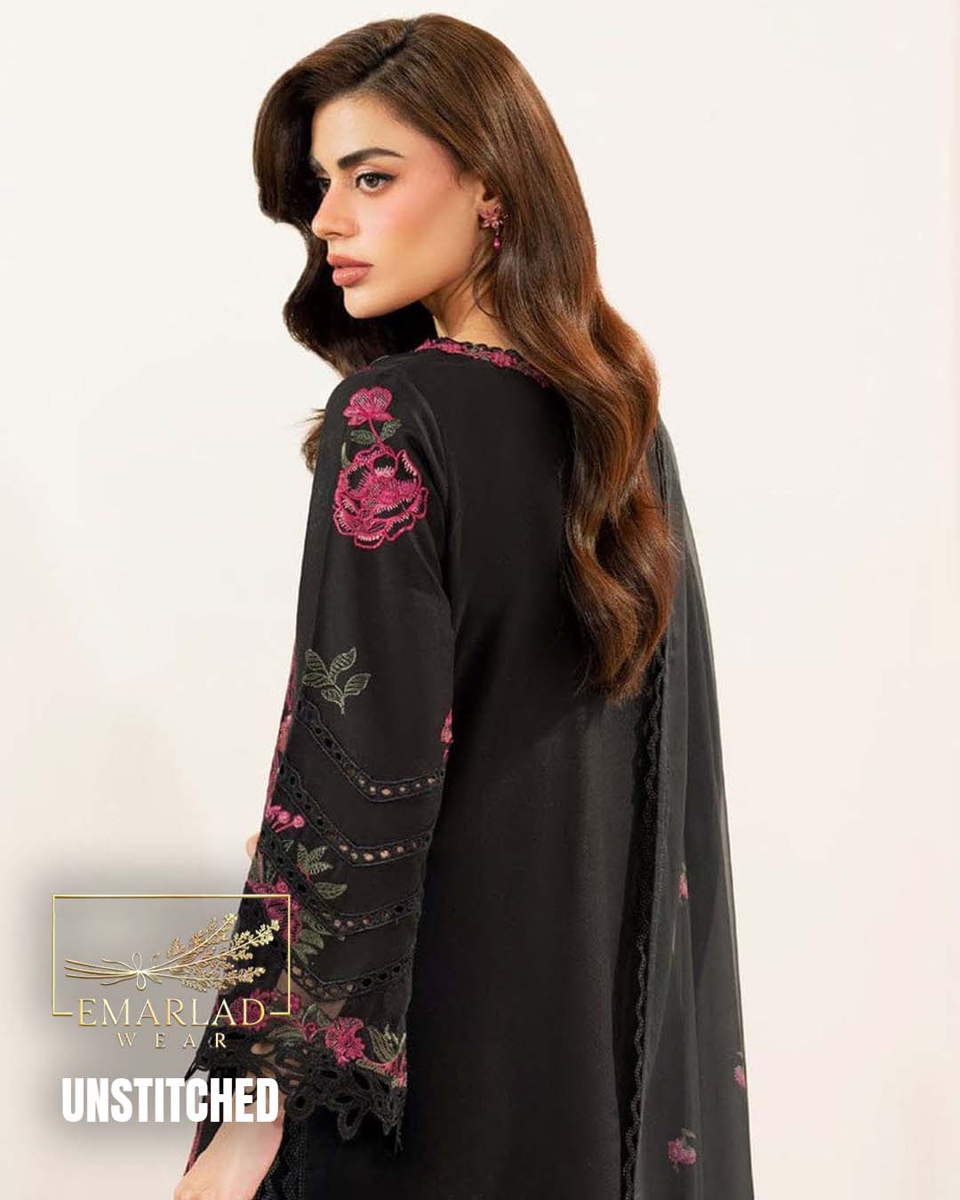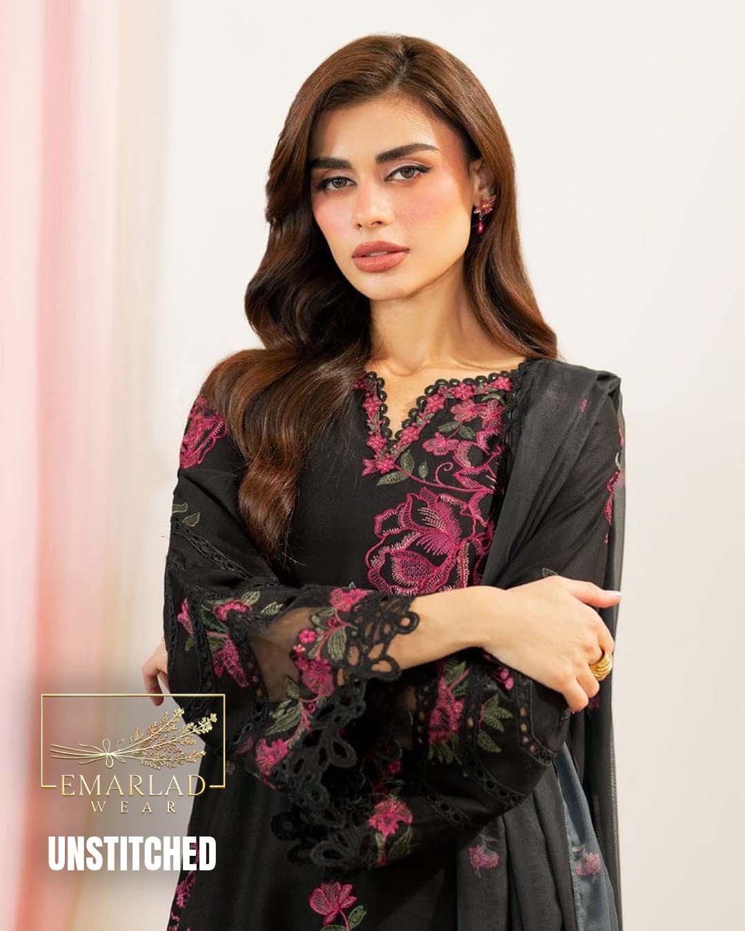 Shop the elegant Iznik (OM) Cotton Embroidered Collection in classic black colour at Emarlad Wear. Crafted from premium cotton fabric with fine embroidery and paired with a luxurious semi-pure silk dupatta, this outfit is perfect for everyday wear and semi-formal occasions. Available now for PKR 4,650 with delivery all over Pakistan.