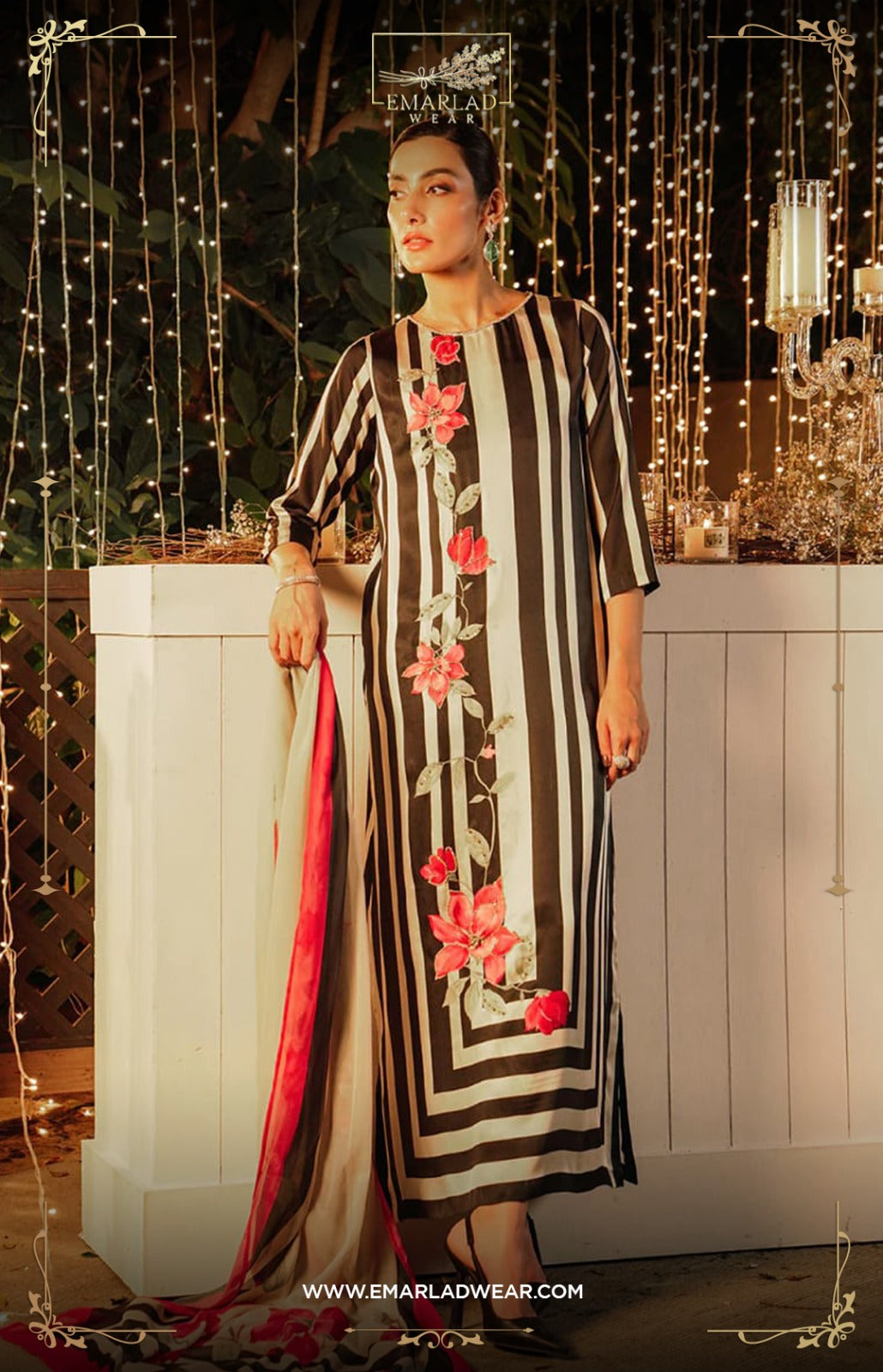 Lulusar Silk Digital Print Black & White Hand Work Dress Party Wear Collection