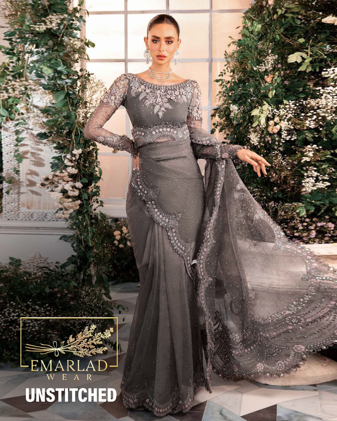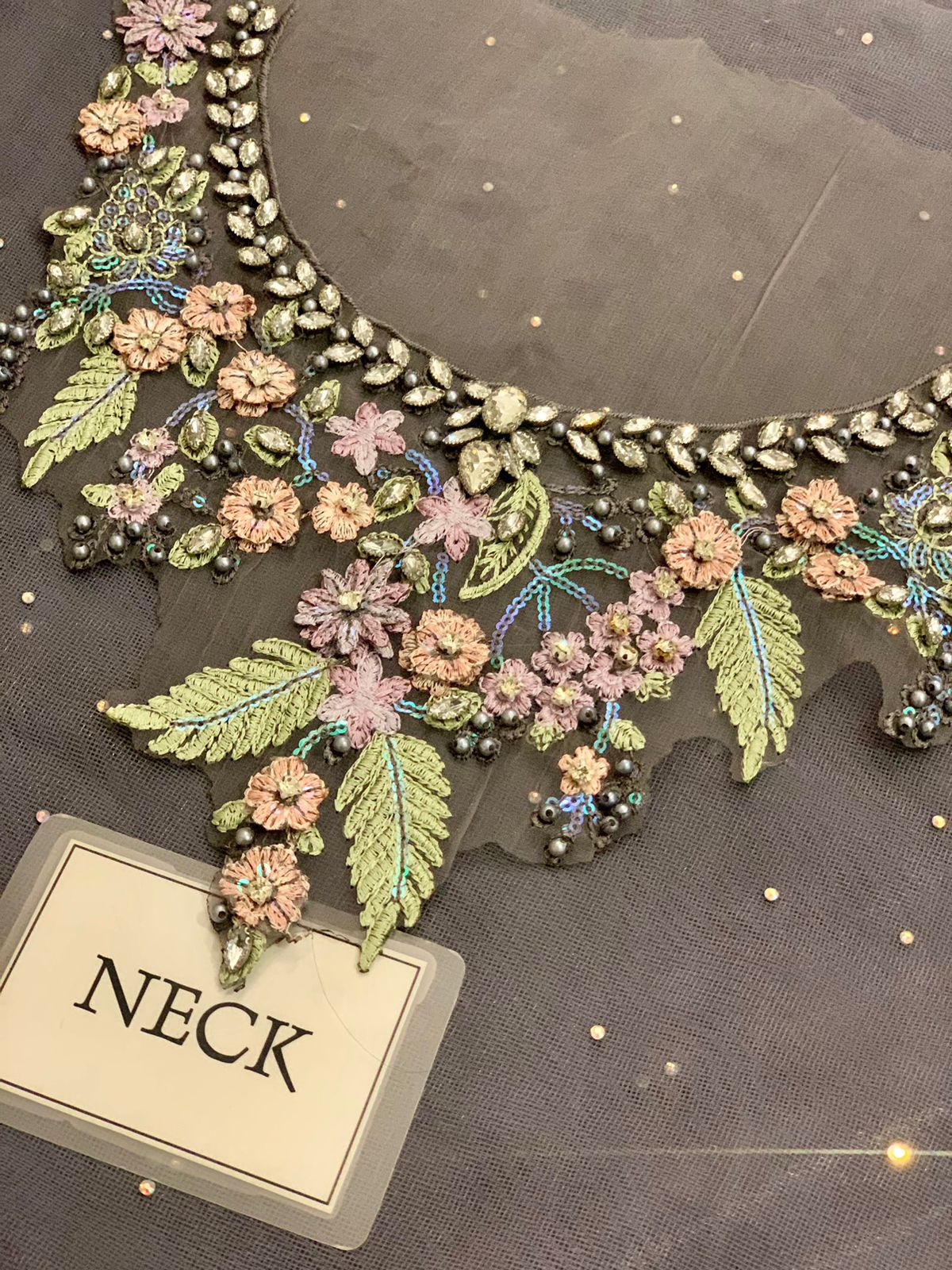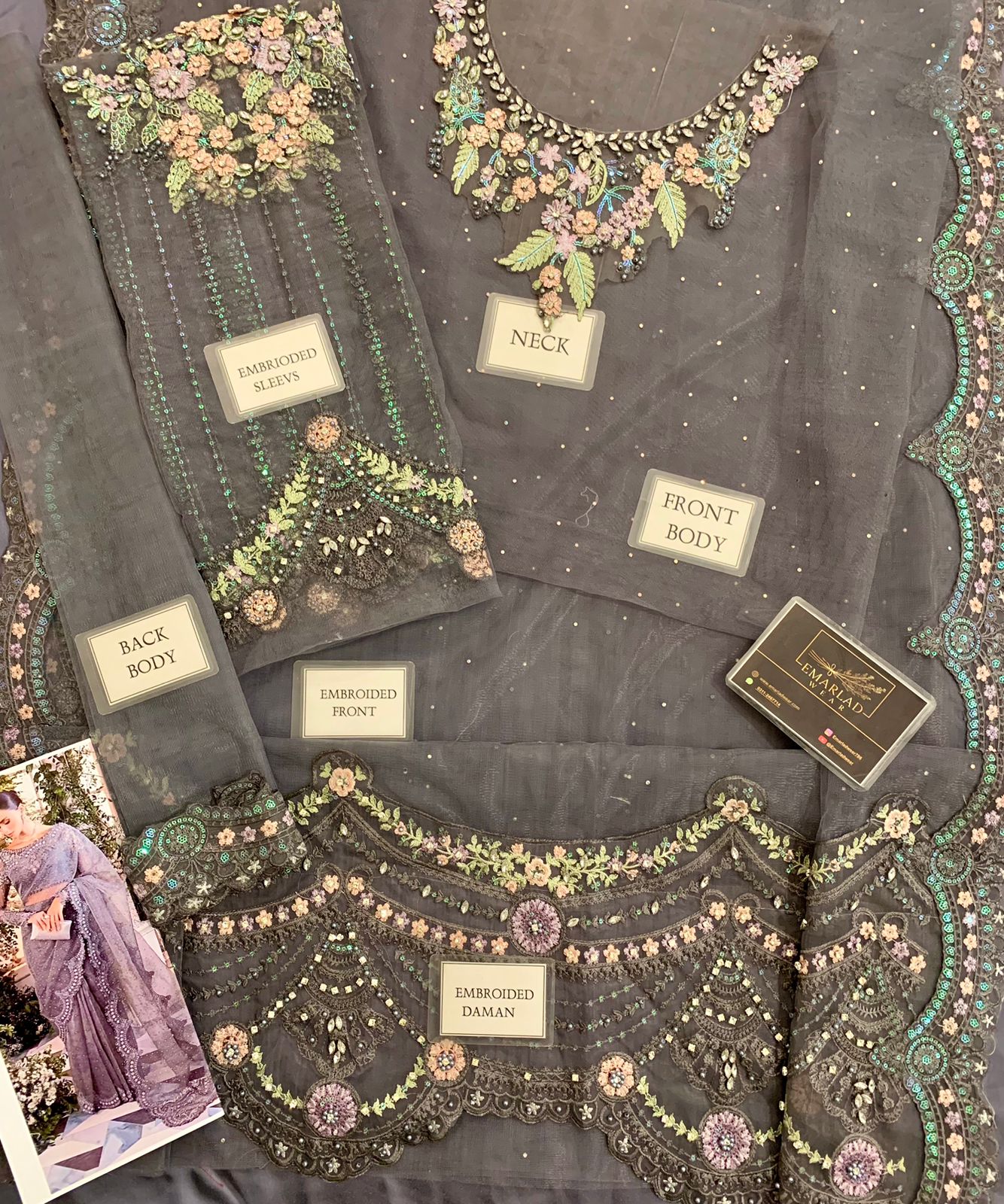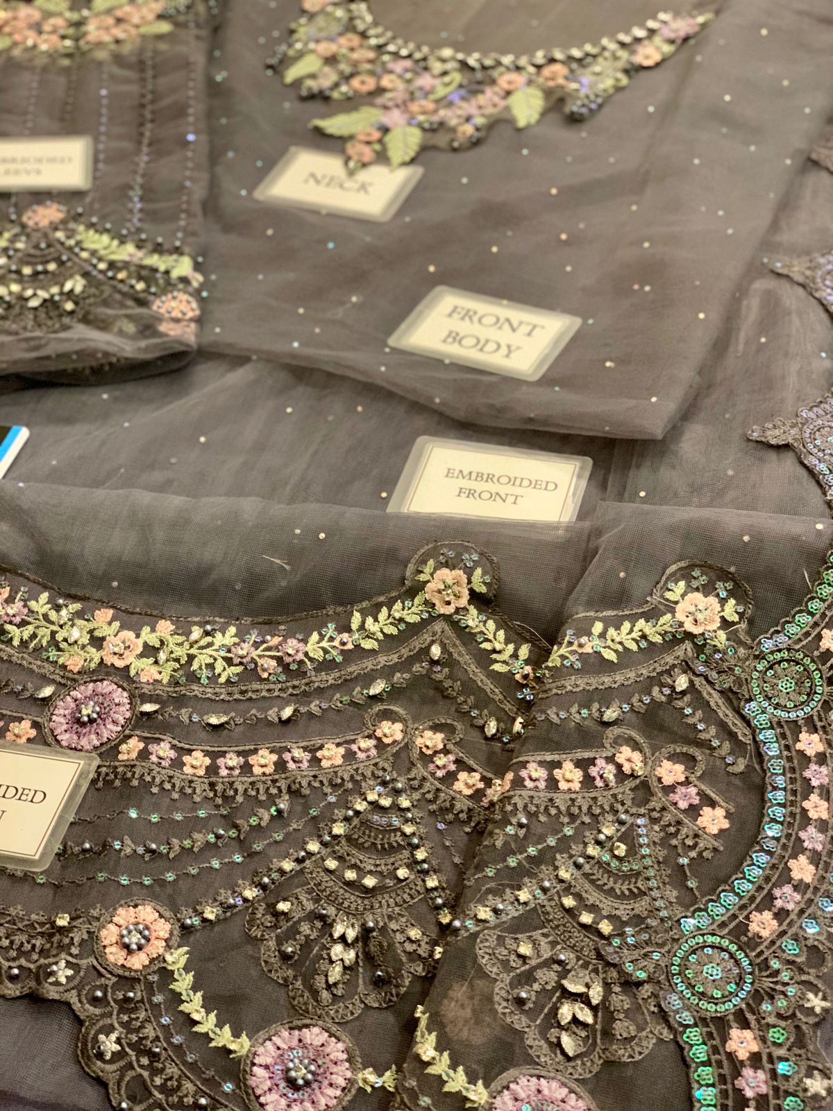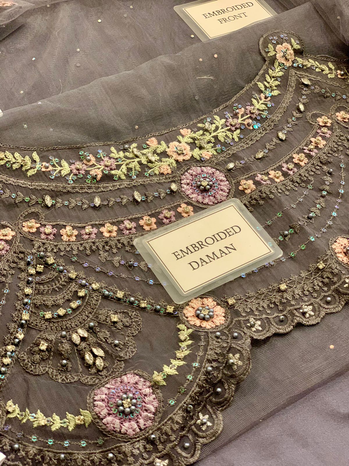 net fully hand embellishment spary stone front body with heavy embroidered spangle work neckline with fully hand emblishment adha work