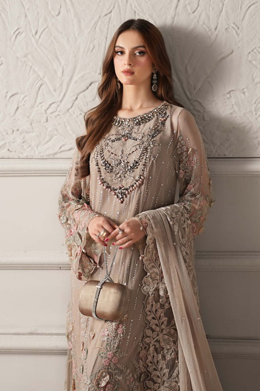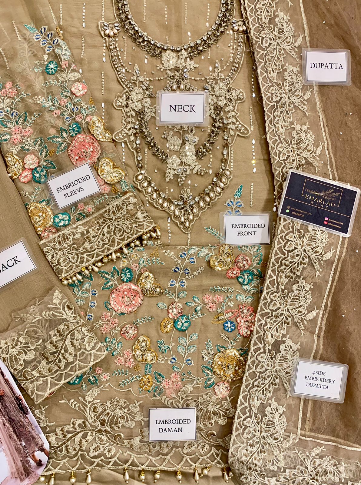 Front: Chiffon fully heavy embroidered sequin (spangle) work with full spray diamond work, 3D flower embellishments, and a heavy embroidered sequin neckline with hand embellishment (adha work). Finished with a heavy embroidered sequin daman border and fancy tussles.
