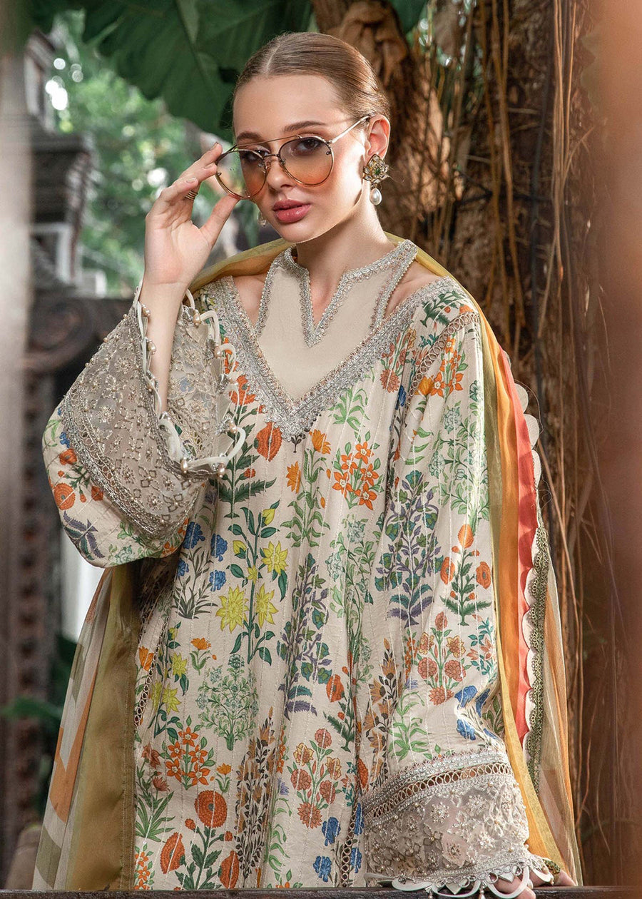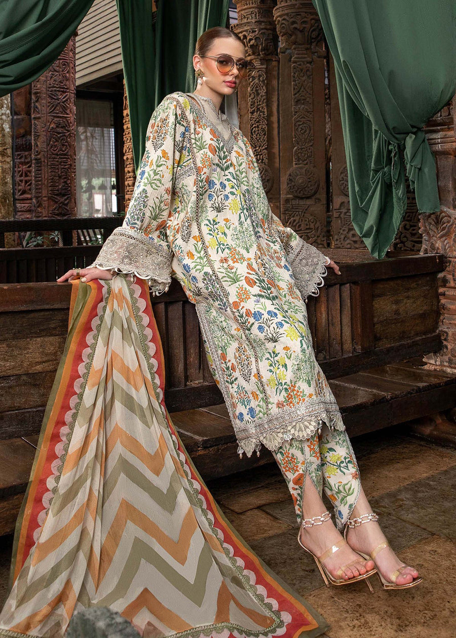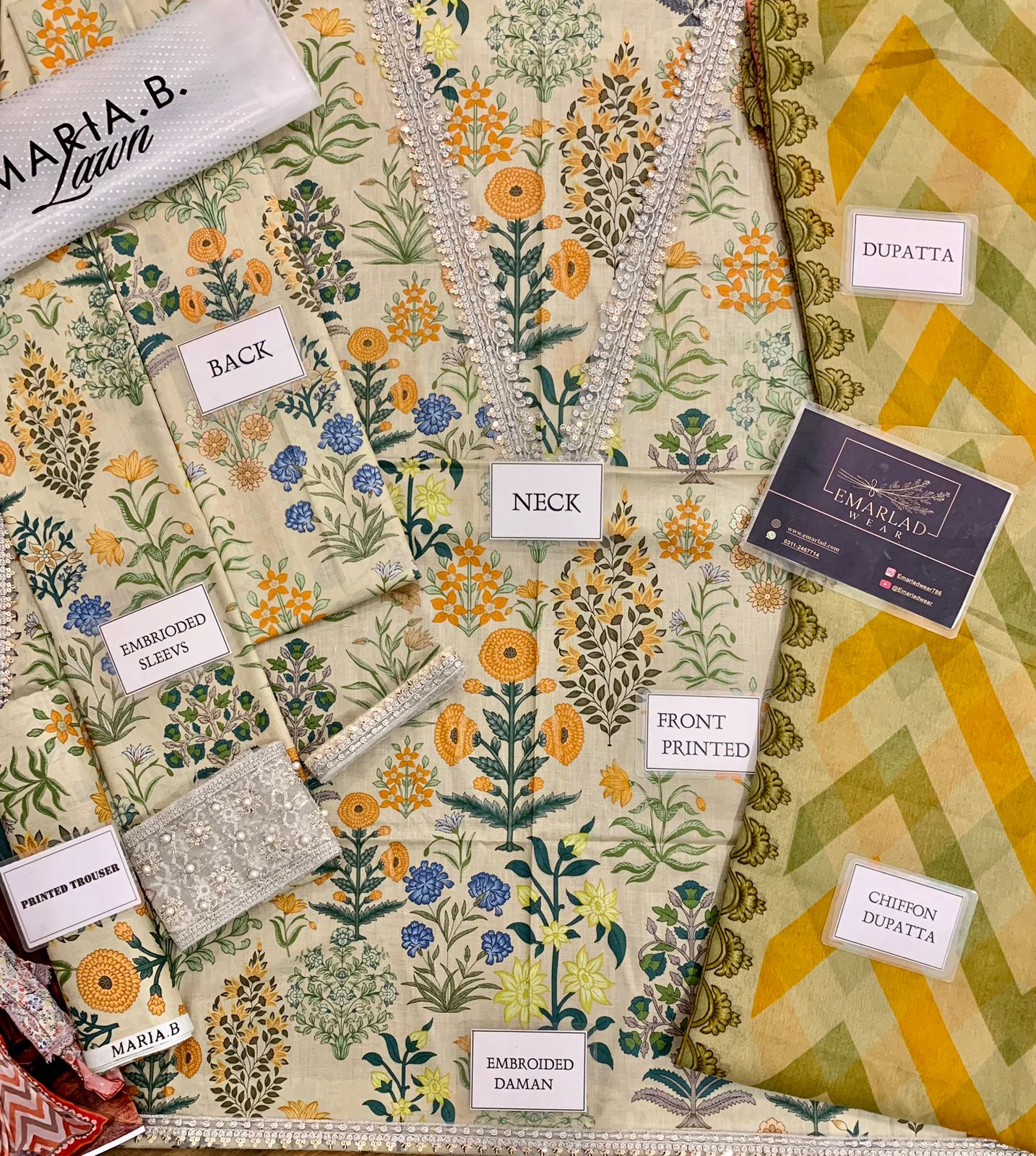 printed lawn front with embroidered spengle work neckline with heavy embroidered spengle work daman boarder with embroidered spengle work chak lace