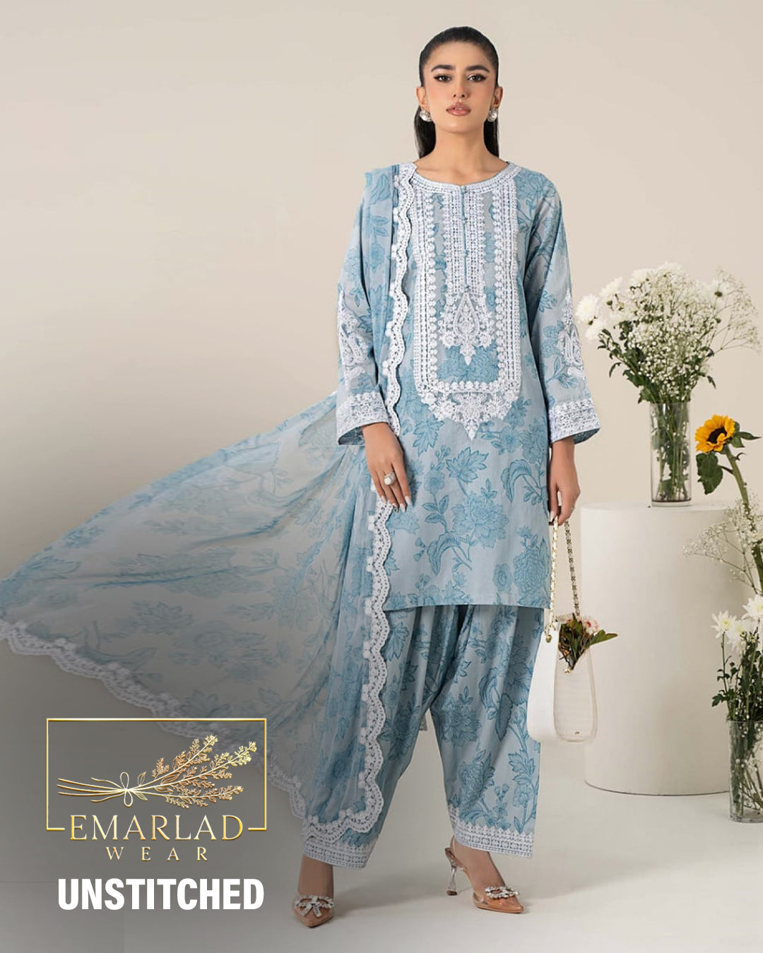 Maria B | Sky Blue - Printed  Lawn With Chiffon Embroidered Dupatta