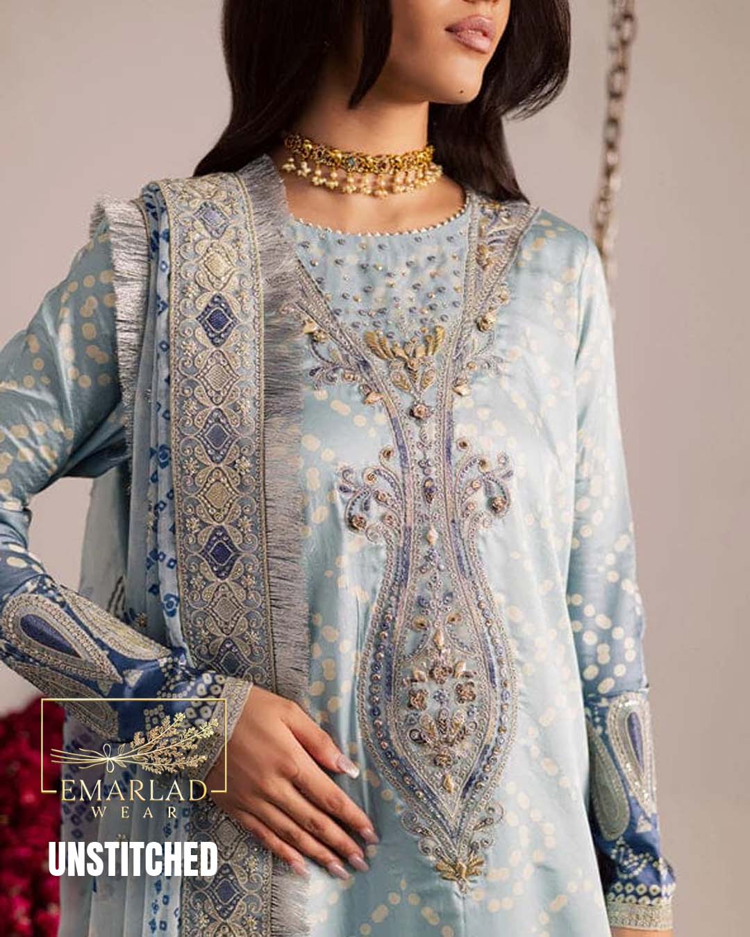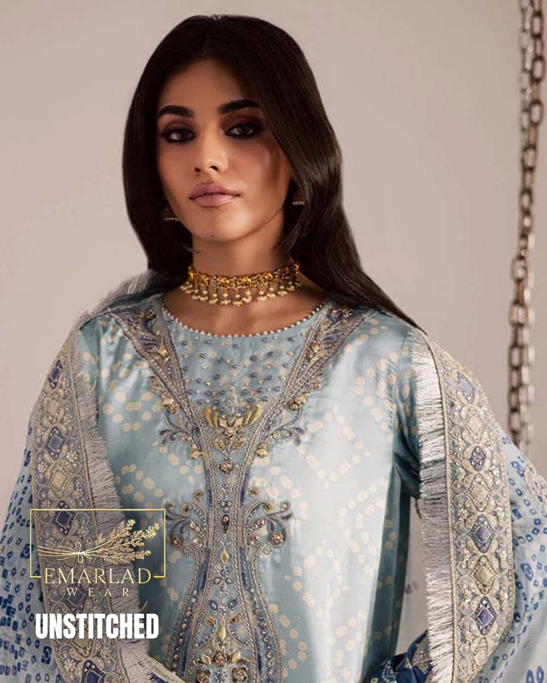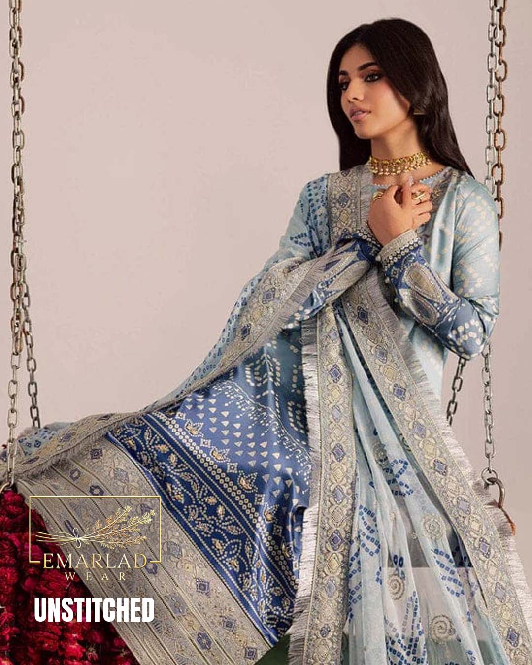 Shop the elegant Nureh Lawn Collection in blue & grey colour combination (Design Code NP-698-699) at Emarlad Wear. This stylish outfit features printed lawn front, back, and sleeves, an embroidered neck patch, embroidered sleeve patches, an embroidered daman patch, and a printed chiffon dupatta with four-side embroidered lace, paired with a dyed trouser. Perfect for summer wear and semi-formal occasions. Available now for PKR 4,350 with delivery all over Pakistan.