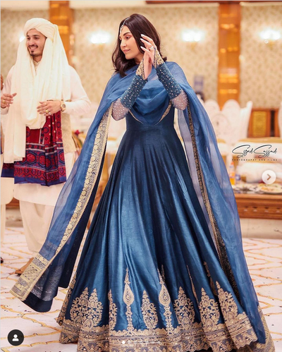 Risma is the classic peshwas reimagined in a soulful symphony of tilla, crystal, sequin, kora and naqshi on organza. This ensemble comes with the evergreen churidar and a billowy organza dupatta to culminate in a statuesque silhouette that is guaranteed to make heads turn.