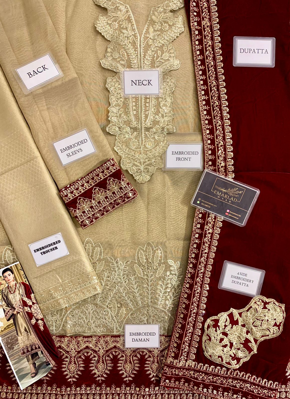 zari organza fully embroidered spangle work front with zari organza spengle work neckline with velvet fully heavy embroidered spangle work daman border
